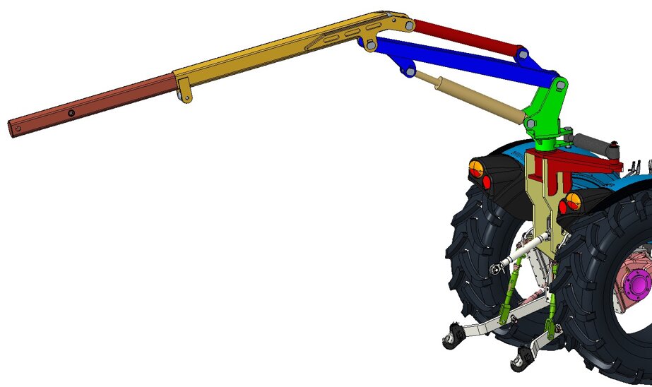 3D modeling and drafting of hydraulic lifting cranes installed on agricultural tractors, intended for lifting and moving loads, in the nursery field.